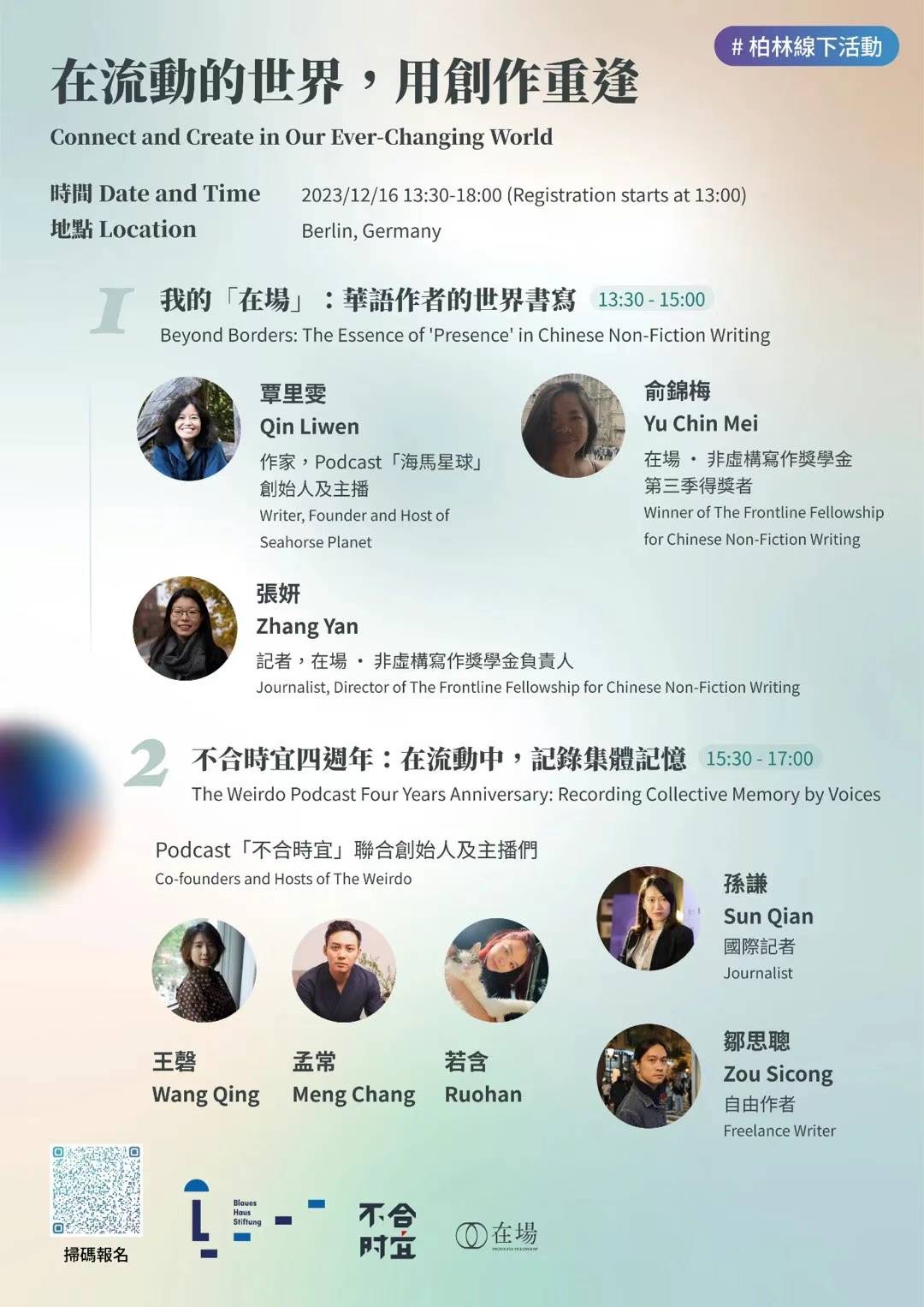 Zum Jahresende 2023 und zum vierjährigen Jubiläum von „The Weirdo“ veranstalten wir gemeinsam mit dem „Frontline“-Stipendium für nichtfiktionales Schreiben eine Veranstaltung in Berlin. Wir werden chinesischsprachige Kulturschaffende aus verschiedenen Bereichen einladen, um gemeinsam über das Schaffen in „Mobilität“ und das „Wiedersehen“ im kreativen Prozess zu sprechen.