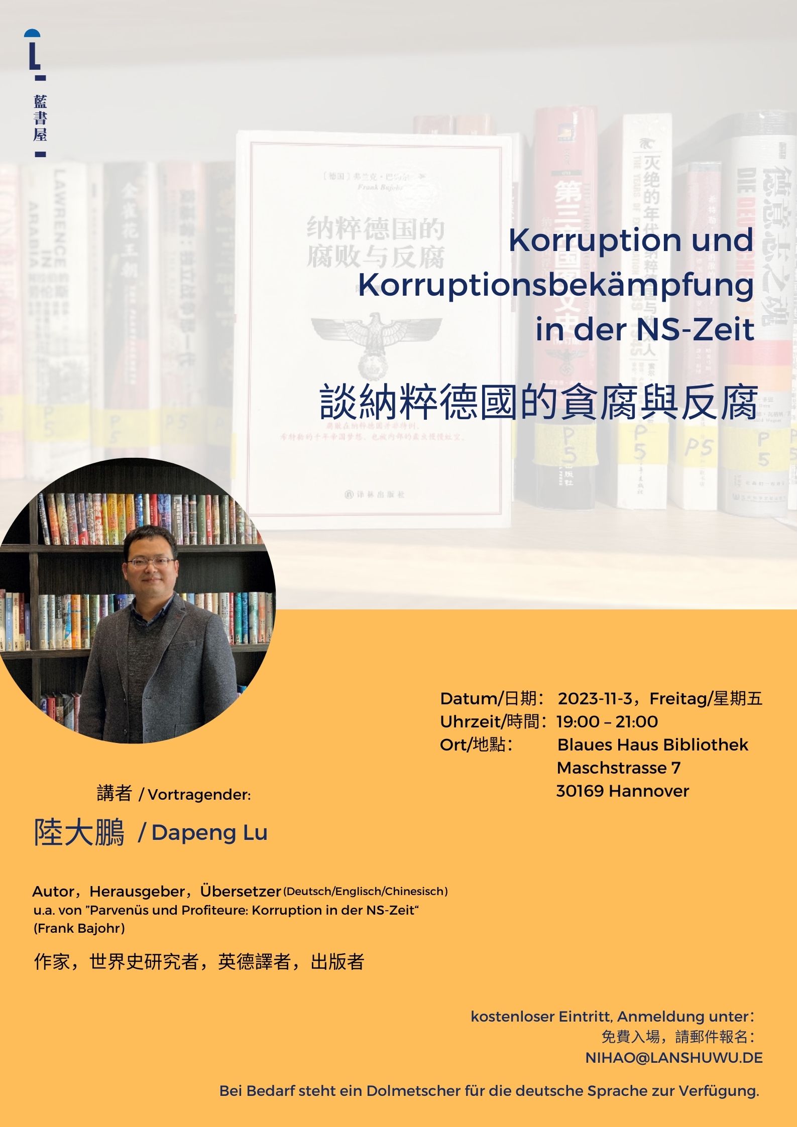在11月,《对话蓝书屋》系列讲座继续进行,这次蓝书屋邀请了译者、作家、世界史研究者陆大鹏。在蓝书屋,他以自己所翻译的弗兰克·巴约尔所著《纳粹德国的腐败与反腐》一书为基础,带领在汉诺威的读者一起,探讨纳粹德国的反腐运动及其对该国历史的影响。讲座提供了对纳粹德国腐败与反腐运动深入的历史分析。